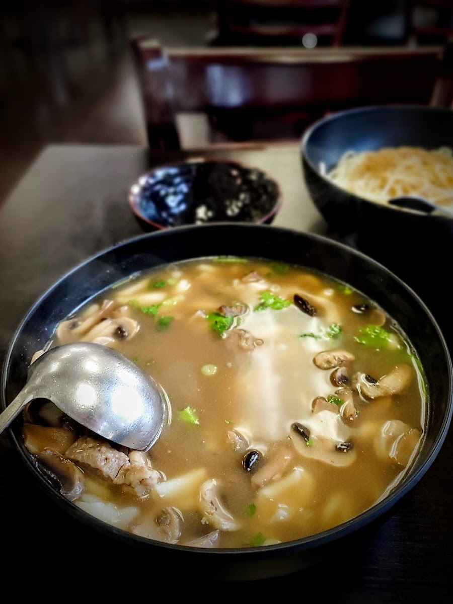 Savory light broth with noodles. Also include lamb meat, black fungus, mushroom and potato.