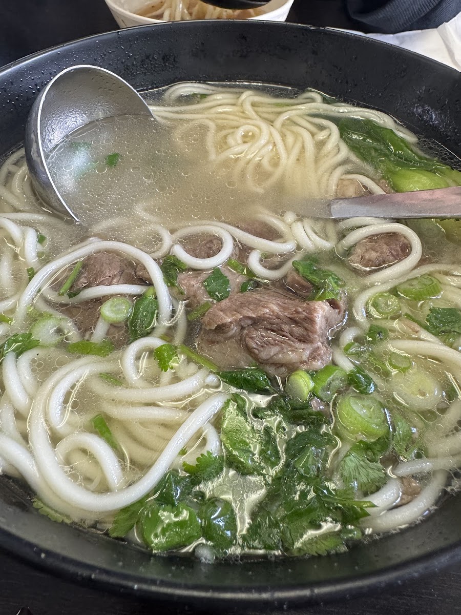 Beef ribfingure meat , noodle with braised soup. Non spicy with white soup. kids favorite.